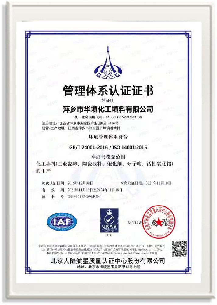 萍鄉市華填化工填料有限公司,位于320國道、109國道、浙贛鐵路、昌金高速公路貫穿其中,交通便利,是江西西部一顆燦爛明珠,創建于20世紀70年代初期,是中國石油天然氣股份有限公司“能源一號網”會員企業、中國石化物資采購電子商務網絡和中國海洋石油總公司采辦業務系統成員單位,是上海大學江西材料基因組工程產業研究院工業陶瓷產業創新聯盟基地,且通過ISO9001:2015質量管理體系、ISO14001:2015環境管理體系、ISO45001:2018職業健康安全管理體系認證的化工填料生產企業。公司擁有陶瓷、塑料、金屬填料、催化劑、活性氧化鋁、分子篩等產品生產線,現有固定資產3616萬元,占地面積3.8萬平方米。公司具有悠久的生產歷史、雄厚的技術力量和先進的生產工藝設備,可生產工業瓷球(支撐劑)、陶瓷、金屬、塑料質的規整、散堆化工填料及分子篩、催化劑、生化濾料、活性氧化鋁、石化助劑、活性炭、環保材料、耐火材料等系列的200多種規格型號產品。